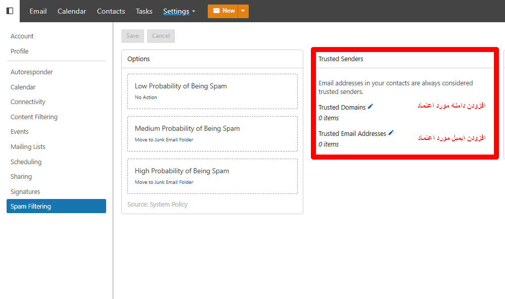 در برخی موارد، ممکن است سرور ایمیل بهدلیل تنظیمات امنیتی و فیلتر اسپم (Spam Filtering)، ایمیلهای دریافتی از برخی فرستندگان معتبر را بهاشتباه به عنوان اسپم شناسایی کند. برای جلوگیری از این اتفاق، میتوان فرستندگان یا دامنههایی را به عنوان Trusted Sender (فرستنده مورد اطمینان) در SmarterMail تعریف کرد تا ایمیلهای آنها همیشه بدون محدودیت دریافت شوند.
