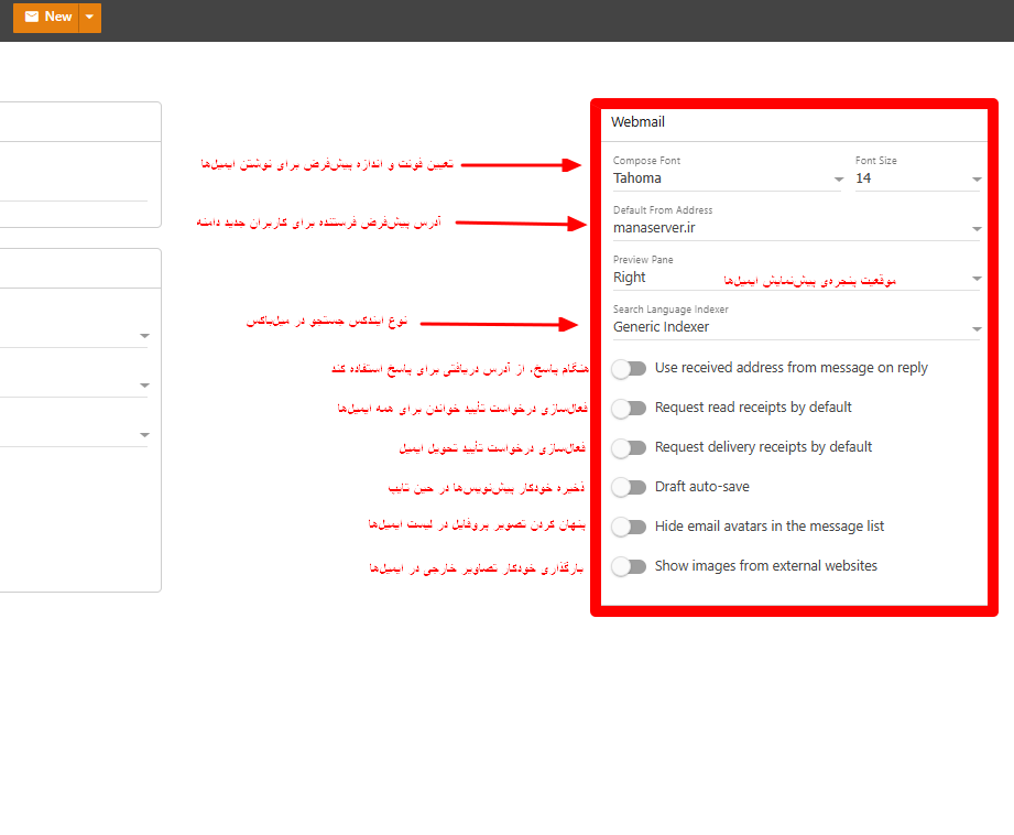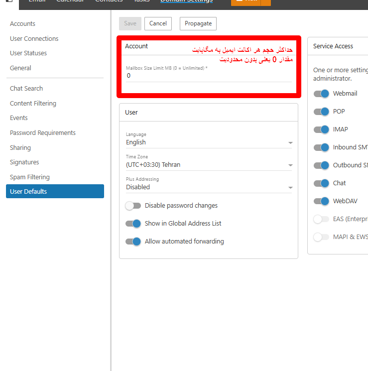| Mailbox Size Limit (MB) | محدودیت فضای اختصاصیافته برای هر اکانت ایمیل بر اساس مگابایت. اگر مقدار را 0 وارد کنید یعنی بدون محدودیت حجم. |