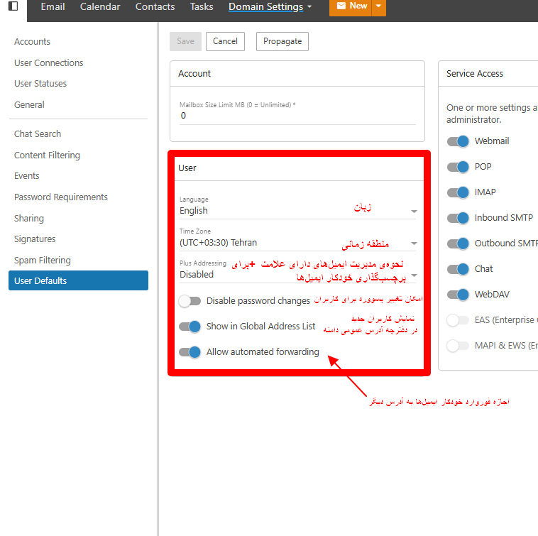 | Allow automated forwarding | اجازه فوروارد خودکار ایمیلها به آدرس دیگر (برای امنیت در بعضی دامنهها غیرفعال میشود) |