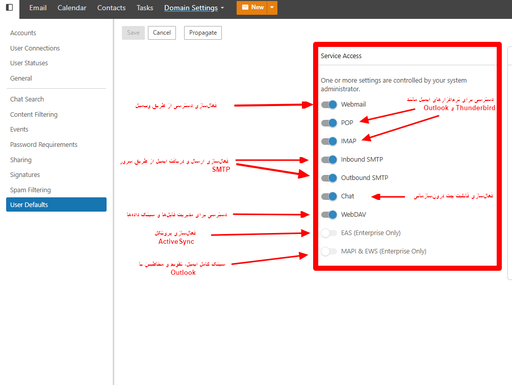 | EAS (Enterprise Only) | فعالسازی ActiveSync برای موبایل و تبلت (فقط در نسخه Enterprise). |