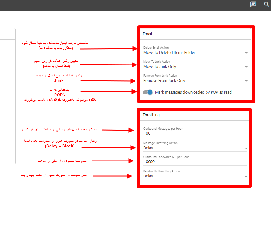 | Message Throttling Action | نوع واکنش سیستم در صورت عبور از حد مجاز تعداد ایمیلها (Delay یا Block). |